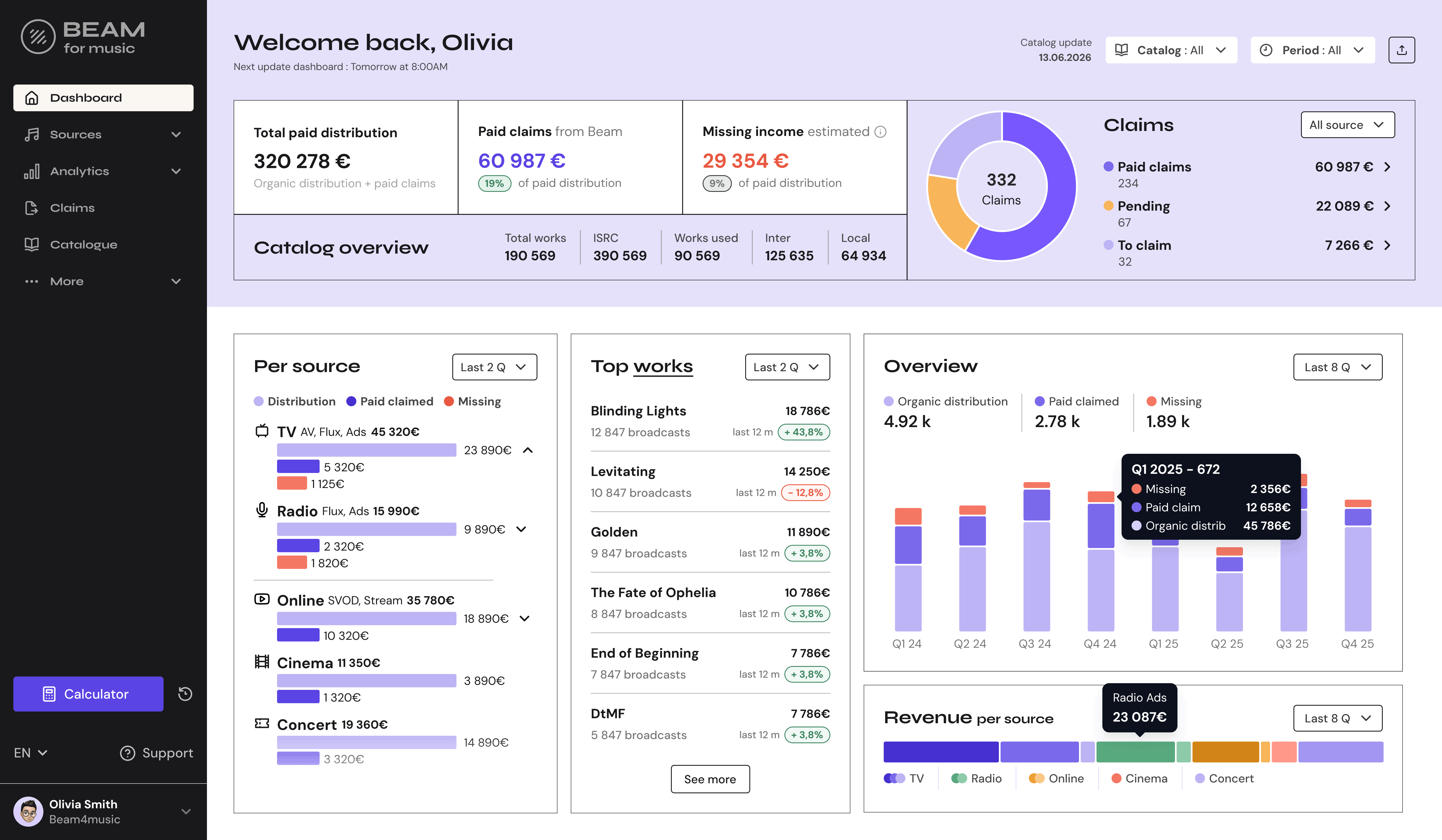 Get a 360° view of where your music is played and what you’ve earned.