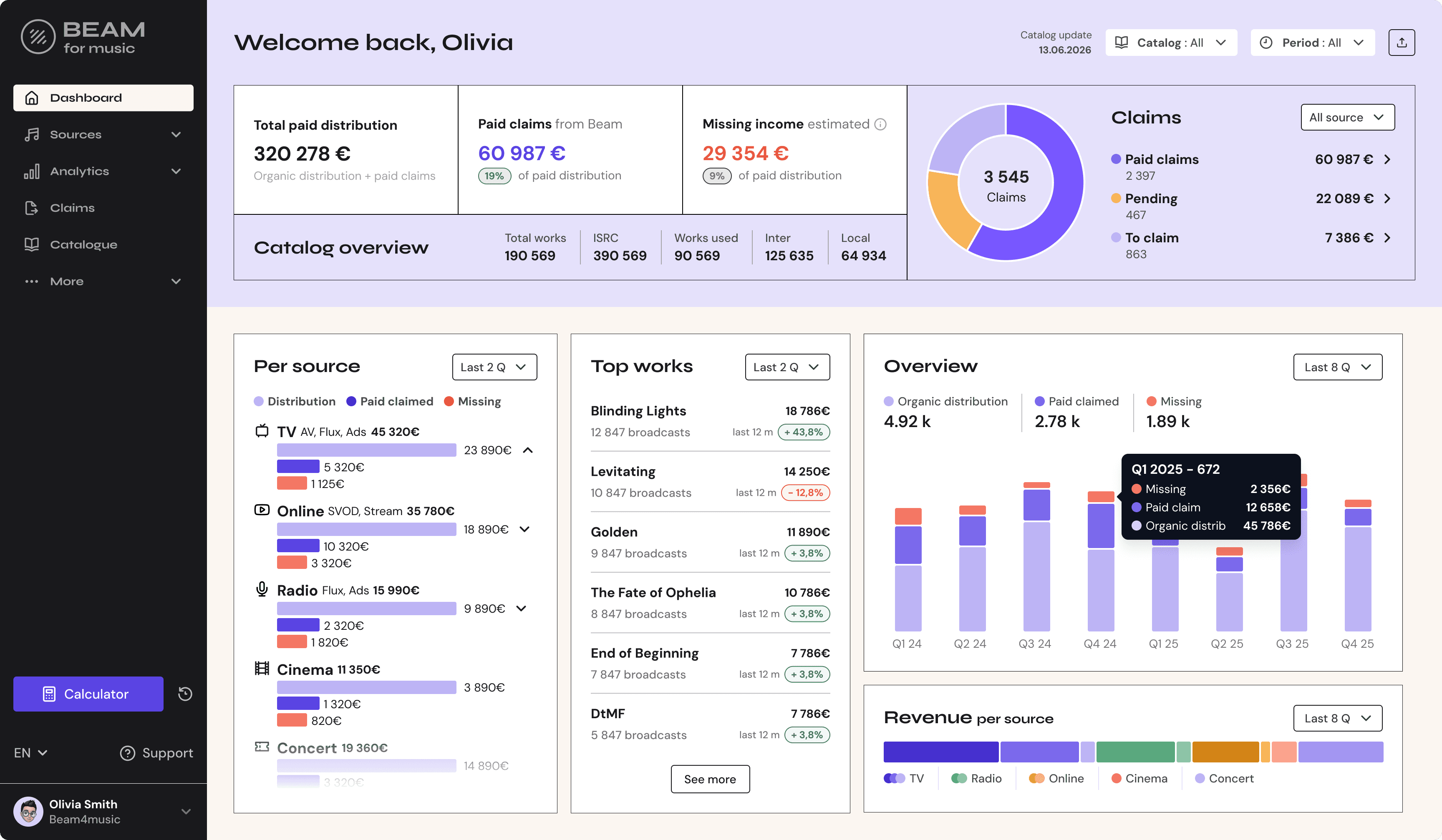 Precise projections of your upcoming royalties and alerts for any expected income that hasn’t shown up. Predictive algorithms help you plan and chase down unpaid royalties.
