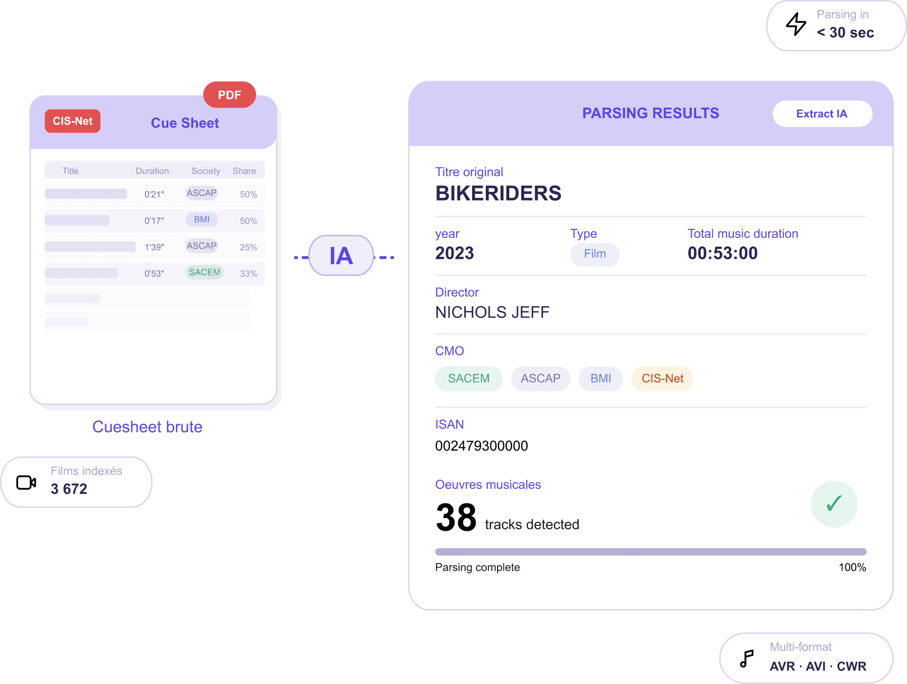 Automatically checks the cue sheet for common issues, flags duplicates and timing gaps or overlaps in the cues. We prevents bad data from flowing downstream and causing payment conflicts or legal troubles.