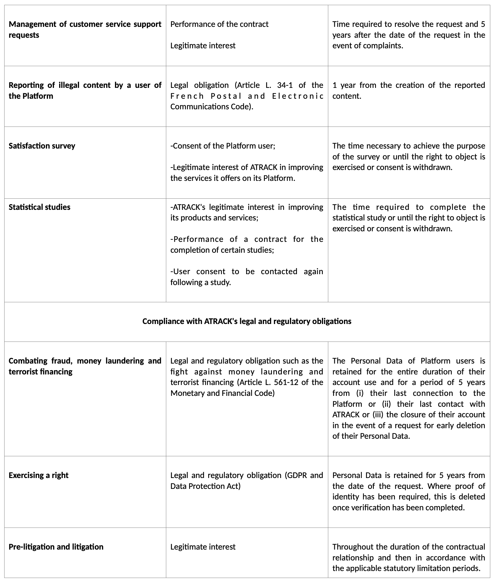 In general, ATRACK retains the Data of its Platform users for a period that does not exceed the time necessary for the purposes for which it was collected, including to meet legal, accounting or reporting requirements.