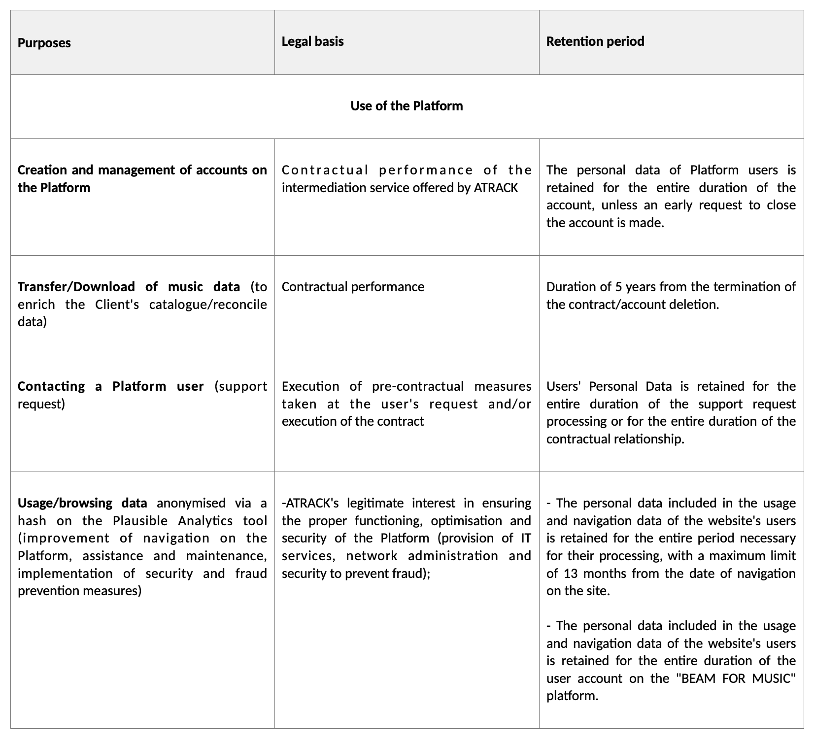 The main reasons justifying the use of BEAM FOR MUSIC Platform users' information are as follows: