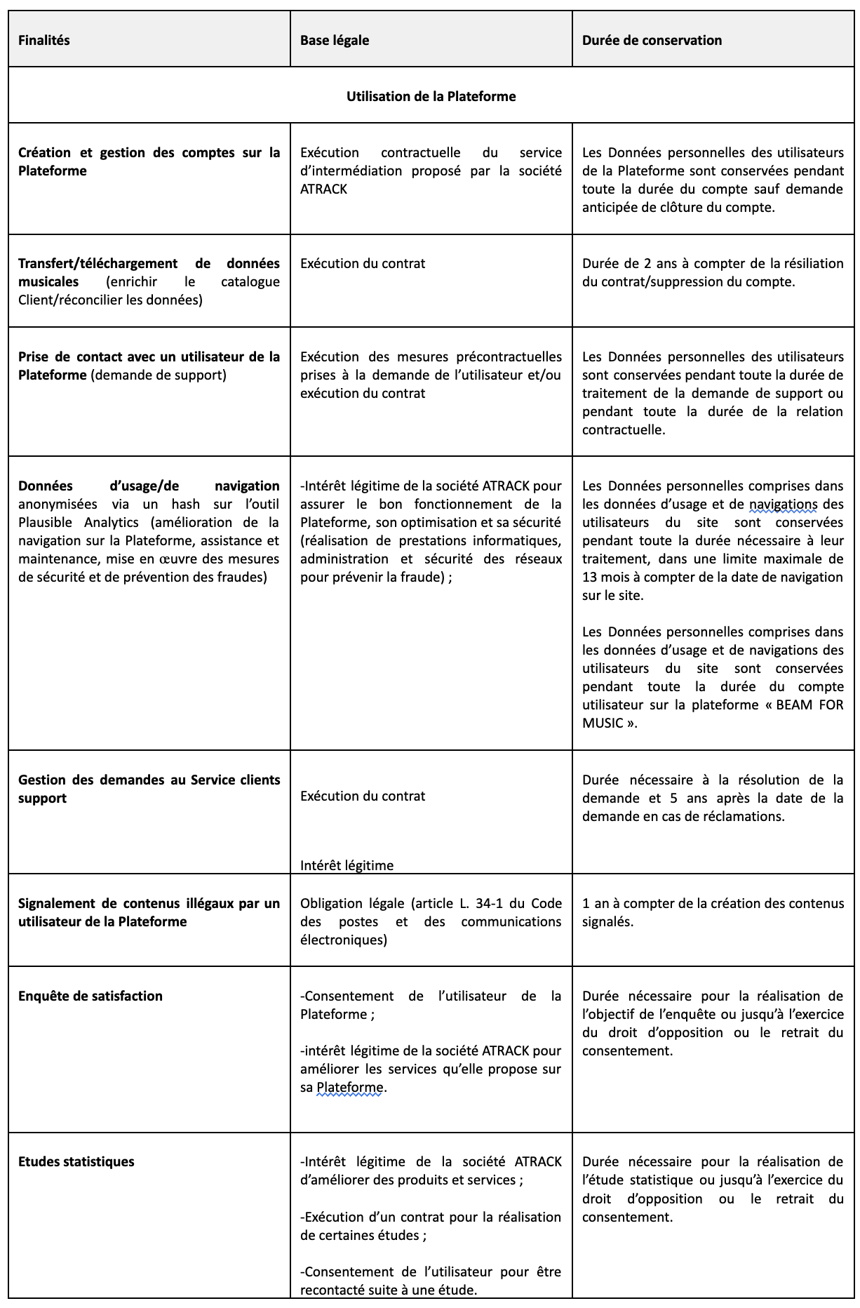 En cas de questions relatives au Traitement des Données personnelles, les utilisateurs de la Plateforme ont la possibilité de contacter la société ATRACK à l'adresse email suivante : contact@beamformusic. La société leur répondra dans les meilleurs délais.